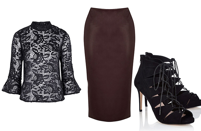 If you’re lucky enough to have an hourglass figure you’ll find that most Victoriana style clothes will fit you. Try adding some Kim-K worthy va-va-voom by teaming a sheer lace top with a leather pencil skirt.